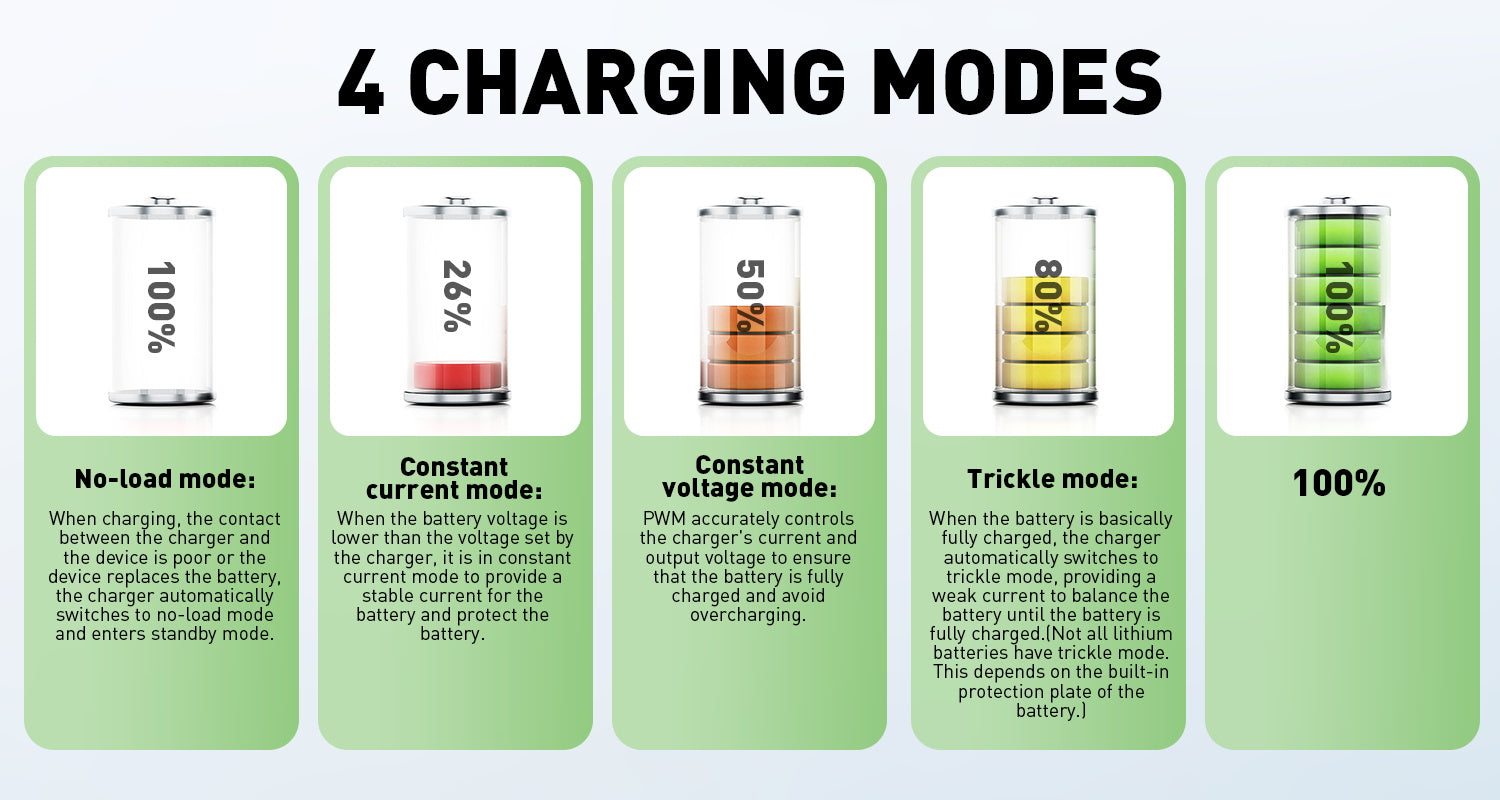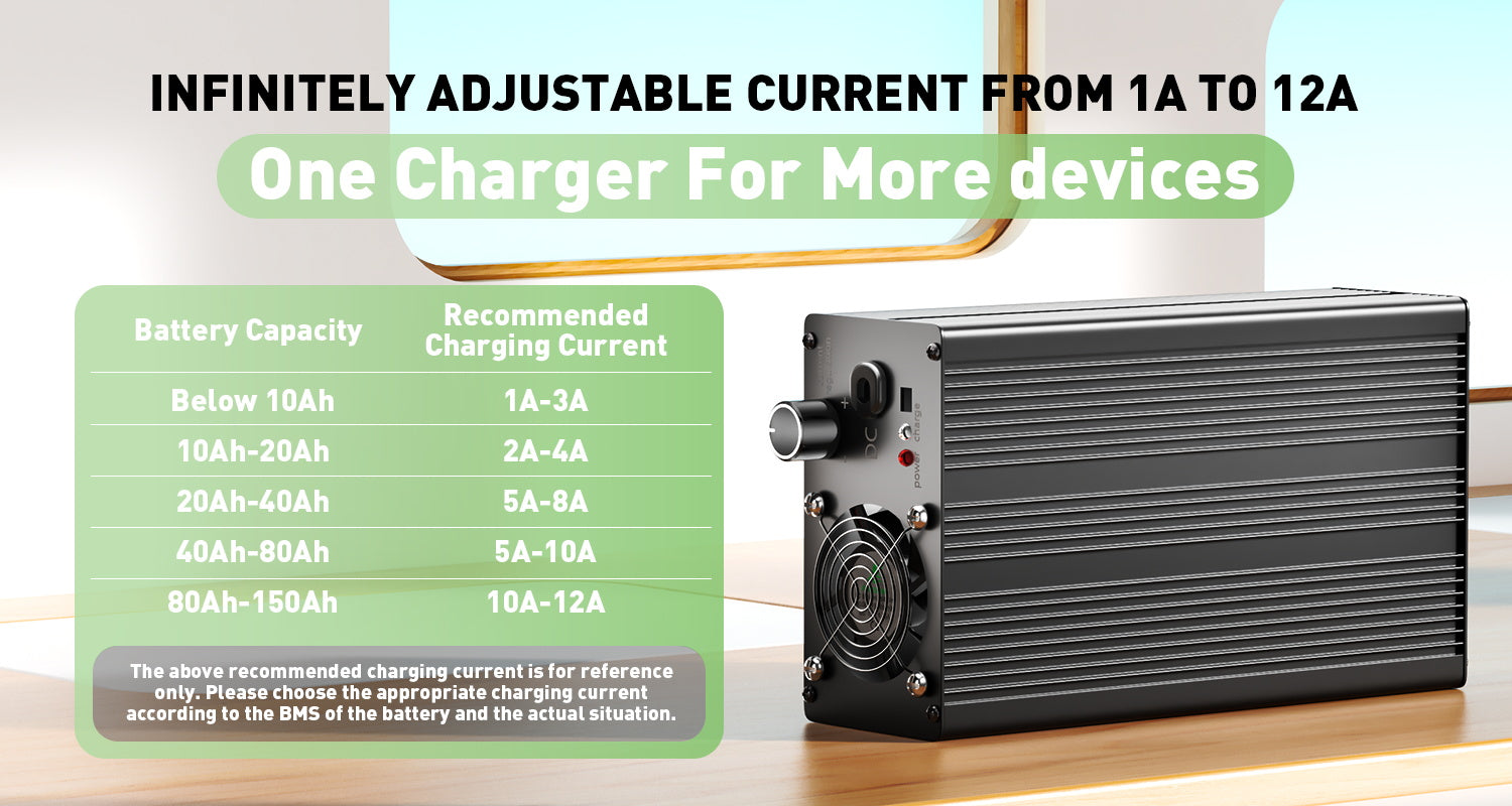 This is a smart adjustable current charger, which offers a range of 1A to 12A with stepless adjustment. When charging small capacity batteries, you can choose a low current; for larger capacity batteries, you can choose a higher current. This single charger meets various charging requirements and offers flexibility and efficiency for different types of batteries.